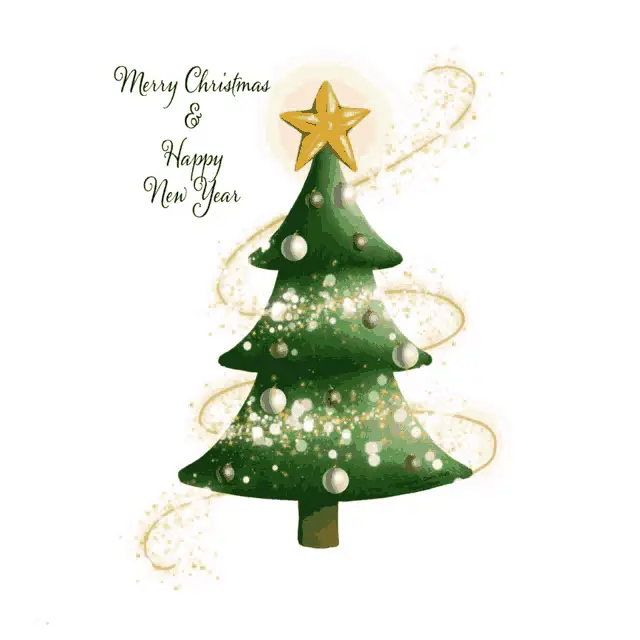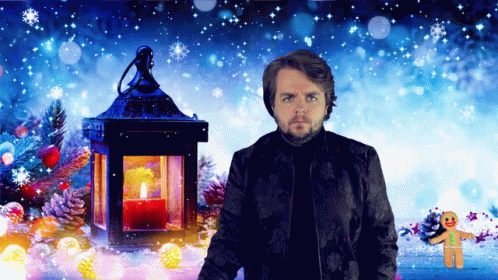 A man wishes Merry Christmas in a festive, snowy setting with a glowing lantern and decorations.