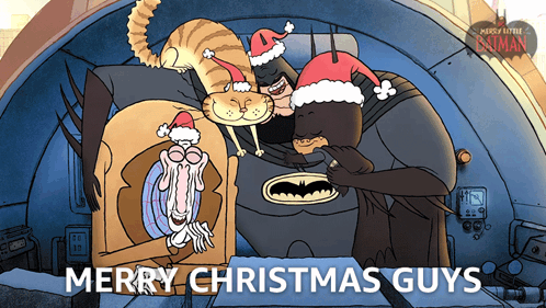 Batman, Alfred Pennyworth, and cats in Santa hats share a Merry Christmas greeting from the world of DC Comics.