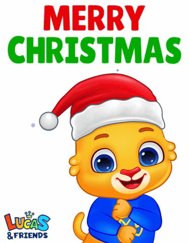 Lucas from Lucas & Friends, a cute cartoon cat in a Santa hat, wishes everyone a Merry Christmas.