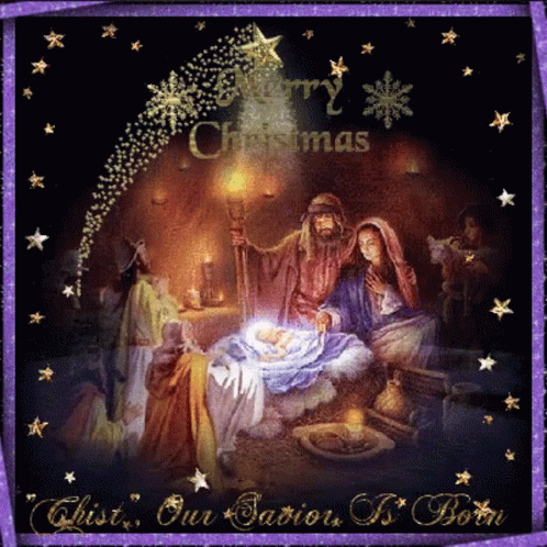 A beautiful nativity scene depicting the birth of Jesus, with Mary, Joseph, and the infant Christ, surrounded by stars and a 'Merry Christmas' greeting.