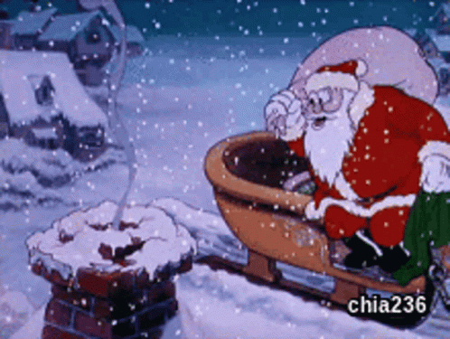 Santa Claus in his sleigh, surrounded by falling snow, spreading Christmas cheer and holiday greetings.
