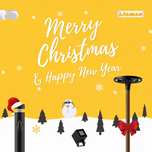 Festive greetings for Merry Christmas & Happy New Year on a yellow background with a cool snowman and lighting products.