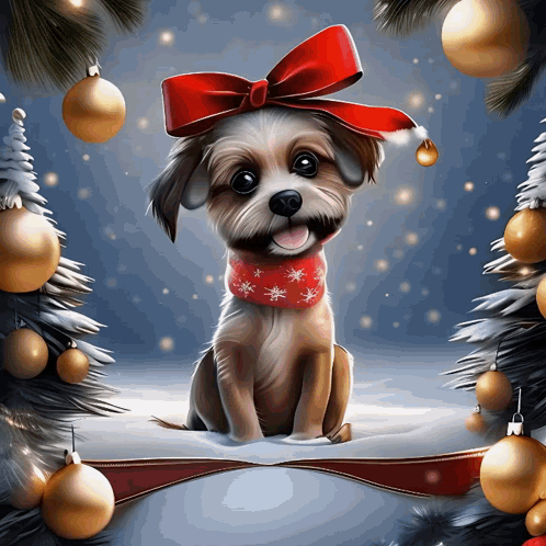 A cute dog wearing a red bow and scarf, surrounded by Christmas decorations, wishing Merry Christmas.