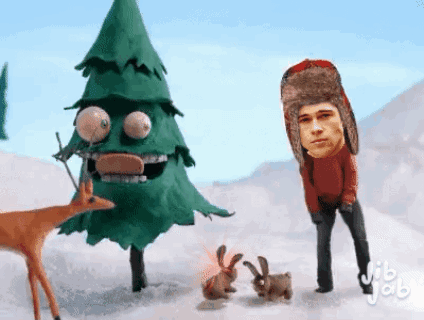 Brad Pitt's face superimposed on a dancing character in a funny Merry Christmas animation with a tree and deer.