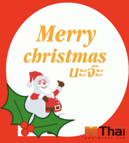 A festive Merry Christmas greeting featuring Santa Claus and holly on a red background with Thai text.