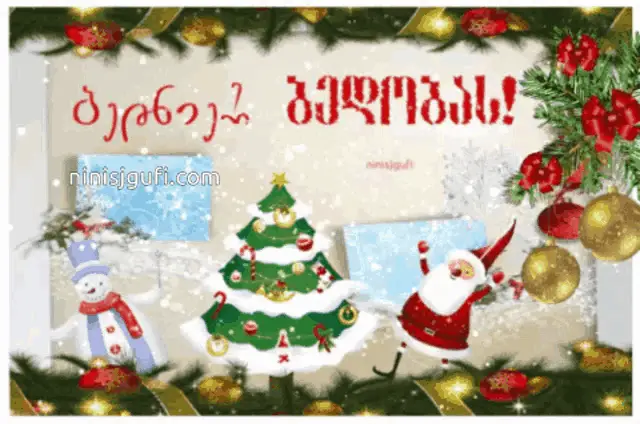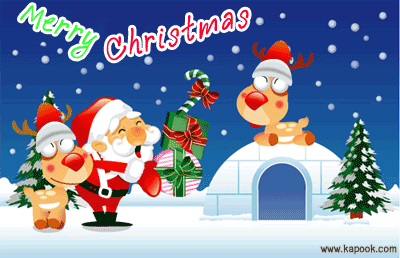 Festive Christmas greeting featuring Santa Claus, his reindeer, and a snowy igloo scene, perfect for the holiday season.