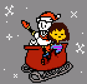 Papyrus and Frisk from Undertale celebrate Christmas, riding a sleigh with the Annoying Dog amidst falling snow.