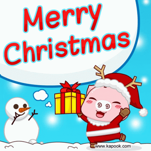 Cute animated pig in Santa hat with gift box and snowman wishing 'Merry Christmas'.