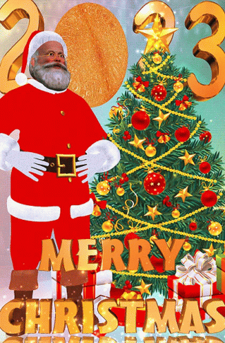 Festive Merry Christmas 2023 greeting card featuring Santa Claus, a decorated tree, and gifts.