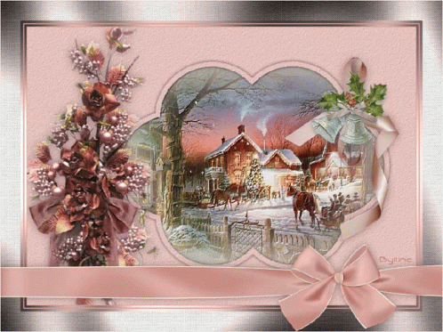 A beautiful Christmas scene featuring falling snow, a festive card, a pink ribbon, and delicate flowers.