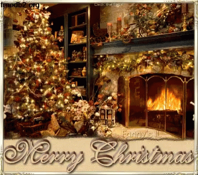 A cozy Merry Christmas scene featuring a crackling yule log in a fireplace, adorned with a festive Christmas tree.