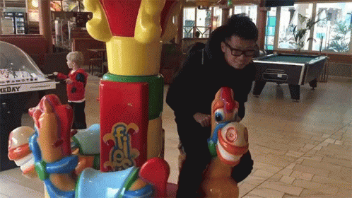 Gen Takagi enjoys a fun ride on a colorful merry-go-round in an indoor play area.