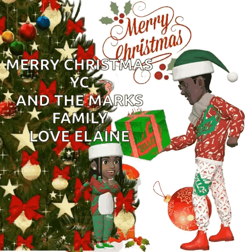 A festive Christmas greeting card from Elaine to YC and The Marks Family, featuring animated characters and a gift.