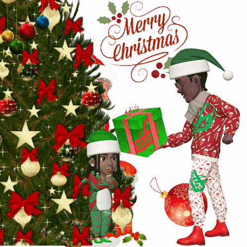 Two festive characters exchange a Christmas gift by a decorated tree, celebrating the holiday season.