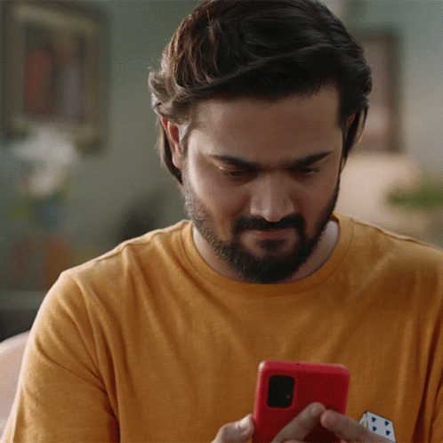 Bhuvan Bam, wearing a yellow shirt, interacts with his red smartphone, possibly sending a message.