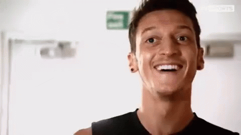 Mesut Ozil is seen in a close-up shot, smiling broadly and laughing, appearing happy and joyful.