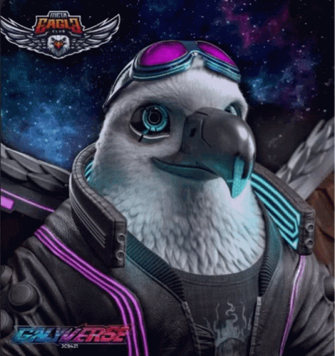 An anthropomorphic eagle character from Meta Eagle Club Galyverse, wearing a futuristic jacket and goggles.