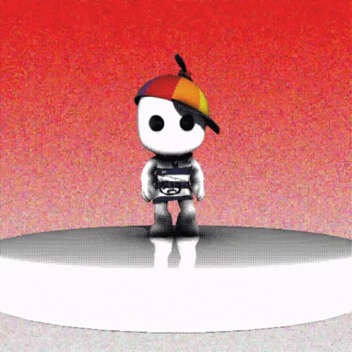 Metajunkie Pluuvo, a cute animated character with a propeller hat and striped shirt, rotates on a pedestal.