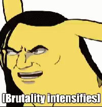 An angry, demonic-looking Pikachu cartoon with the text 'BRUTALITY INTENSIFIES' below, in a Metalocalypse style.