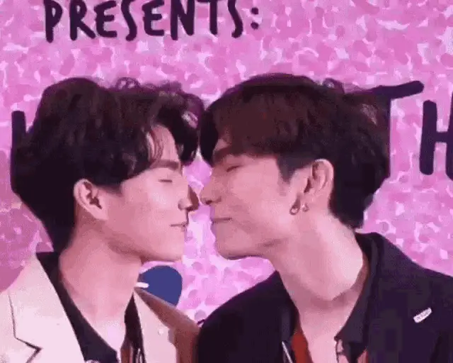 Mew and Gulf share a tender kiss, a sweet moment from TharnType The Series.