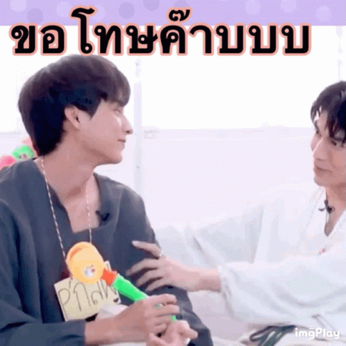 Mew Suppasit and Gulf Kanawut share a sweet moment, with Gulf playfully hitting Mew and then hugging him, captioned "Sorry".
