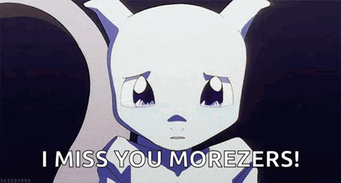 Mewtwo, the iconic Pokemon, looks sad and cries, expressing 'I miss you morezers!' with tears in its eyes.