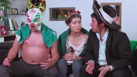 A Mexican luchador, Adelita, and a man in a sombrero pray intently while watching a football match.