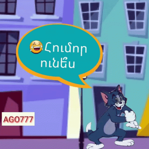 Tom and Jerry cartoon featuring Armenian text asking 'Do you have humor?' and inviting viewers to 'Join us' with the AGO777 watermark.