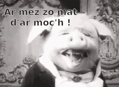 A black and white image of a pig-like character with a wide grin, featuring the Breton caption 'Ar mez zo mat d'ar moc'h!'.