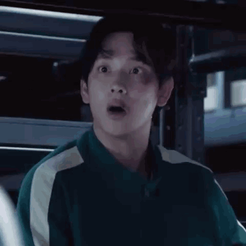 Myunggi, wearing a Squid Game uniform, and a cat both show hilariously surprised reactions.