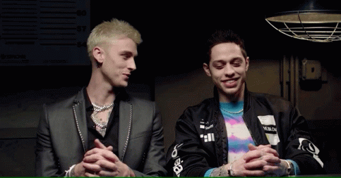 Machine Gun Kelly and Pete Davidson share a laugh, sitting side-by-side with Pete wearing a 'VISION' jacket.