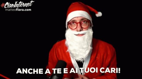 Matteo Flora, dressed as Santa Claus, delivers a festive greeting: 'Anche a te e ai tuoi cari!'