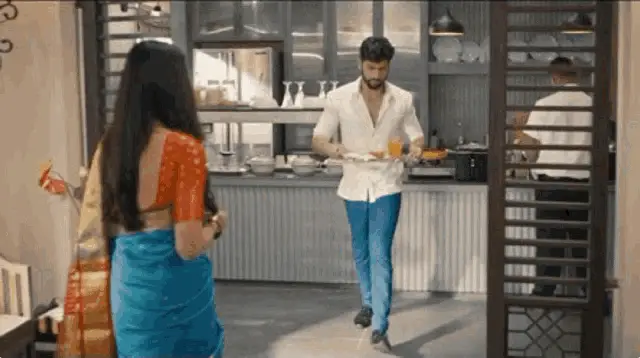 Mhrw Amma, dressed in a saree, talks to another woman in an indoor setting.