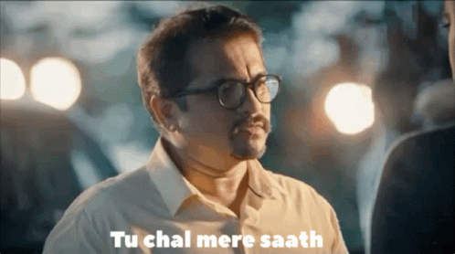 A man with glasses and a mustache speaks, saying 'Tu chal mere saath' (You come with me).