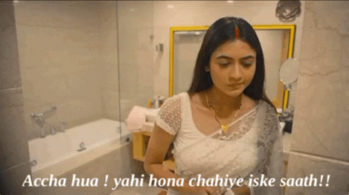 Shivangi Khedkar in Mhrw Pallu, reacting with a smirk to the caption 'Accha hua! yahi hona chahiye iske saath!!'