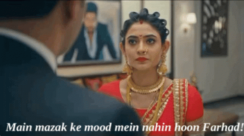 A woman in a red saree and traditional jewelry tells Farhad, 'I am not in the mood for jokes!'