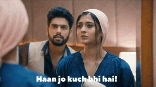 Raghavrao and a woman in Mhrw, sharing a moment with the dialogue 'Haan jo kuch bhi hai!' in front of a mirror.