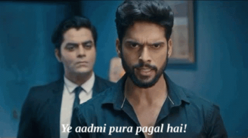 Raghavrao angrily exclaims 'Ye aadmi pura pagal hai!' while another man stands behind him.