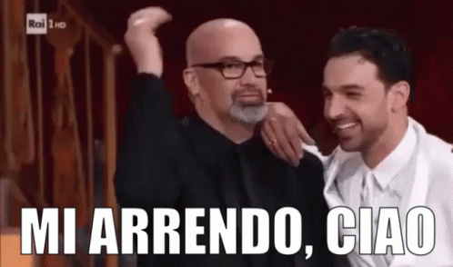 Two men on an Italian TV show, one waving, with the phrase 'Mi Arrendo, Ciao' (I Give Up, Goodbye) displayed.