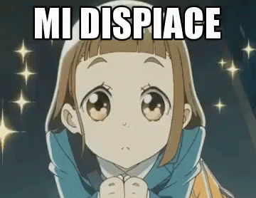 An apologetic anime girl with big eyes and sparkling effects, expressing regret with the text 'Mi Dispiace'.
