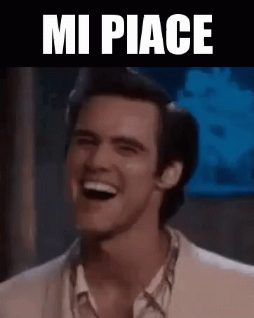 A man laughs joyfully with the Italian phrase 'Mi Piace' (I Like It) displayed above him, expressing approval.