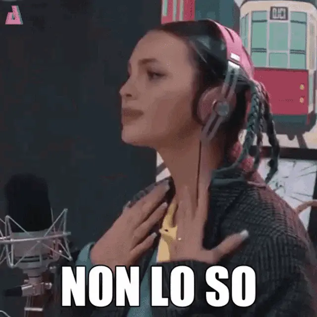 Italian singer Annalisa makes a funny face with her hands up, saying 'Mi Raccomando'.