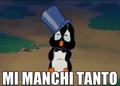 A melancholic cartoon penguin in a top hat expresses deep longing with the words 'I miss you so much'.