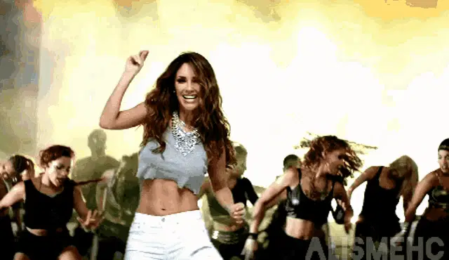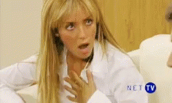 Anahi Miacolucci, with blonde hair and a white shirt, looks surprised with her hand on her chest.
