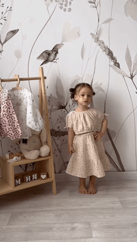 Miakulikova showcases a beautiful light-colored dress, posing charmingly in a room with floral wallpaper.