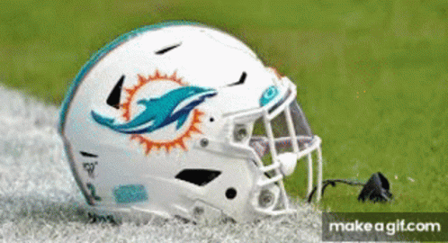 Miami Dolphins helmet on the field, followed by enthusiastic fans cheering with a team flag in the stadium.