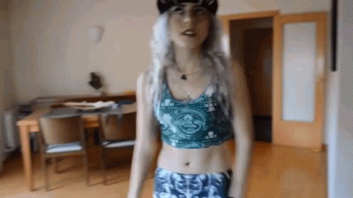Miare, with grey hair and a cap, looking bored while standing in a room, wearing a crop top and shorts.