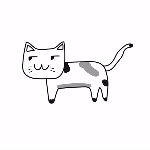 A charming drawing of a white cat with black and gray spots, saying 'Miau!' with a happy expression.