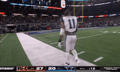 Micah Parsons, a football player wearing number 11, walks off the field looking upset during a game.