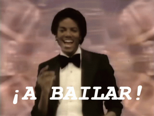 Michael Jackson in a tuxedo, smiling and dancing with '¡A BAILAR!' text overlay.